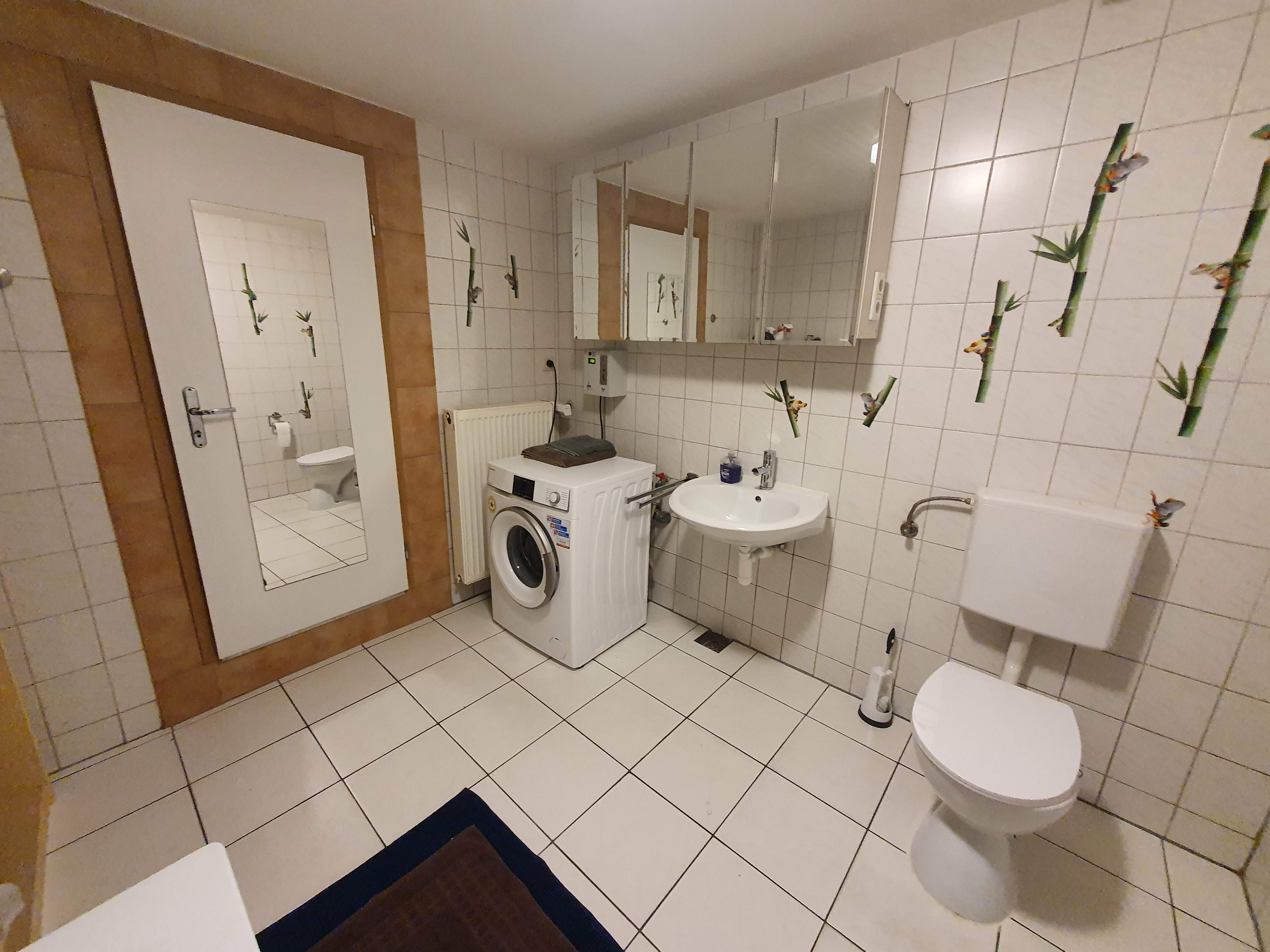 Bad 1: Waschbecken, Dusche, Badewanne, Föhn, viel Stauraum, viel Ablagefläche